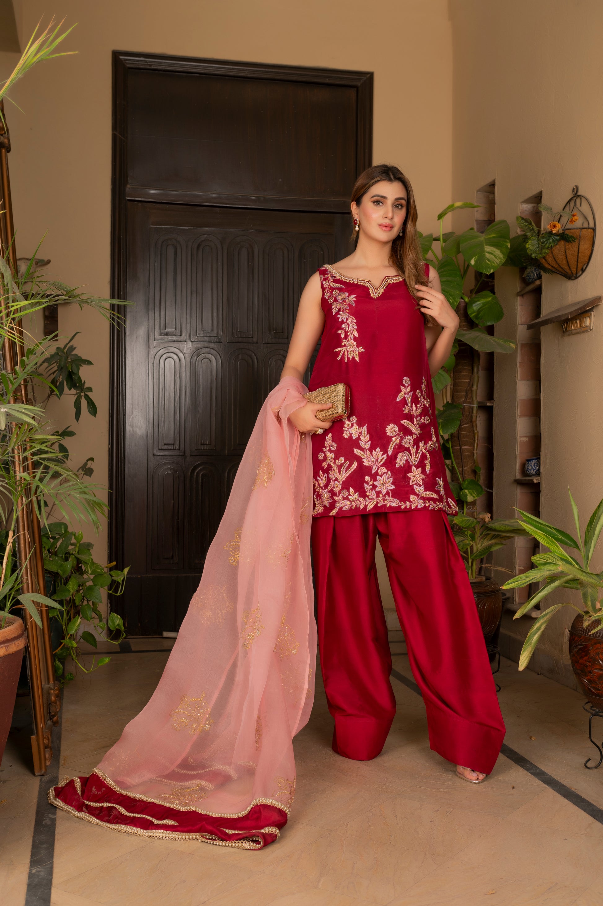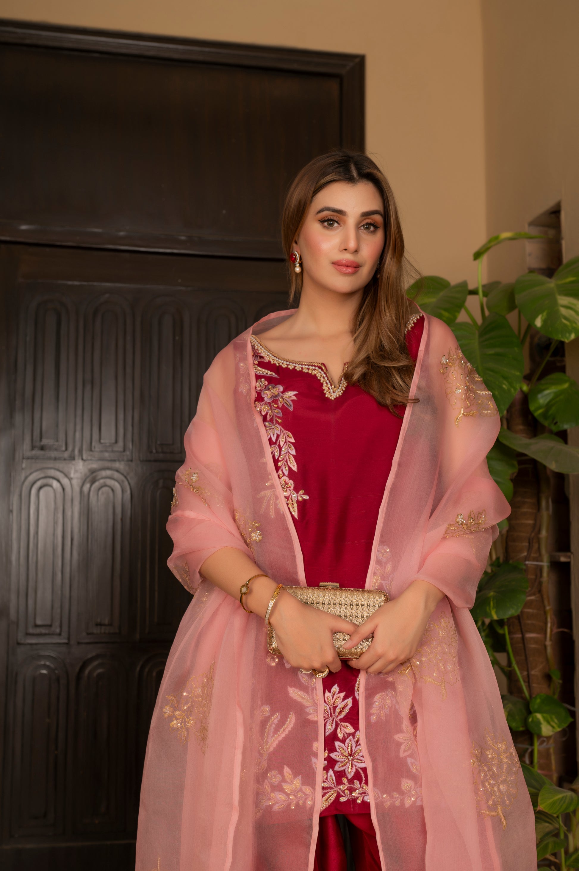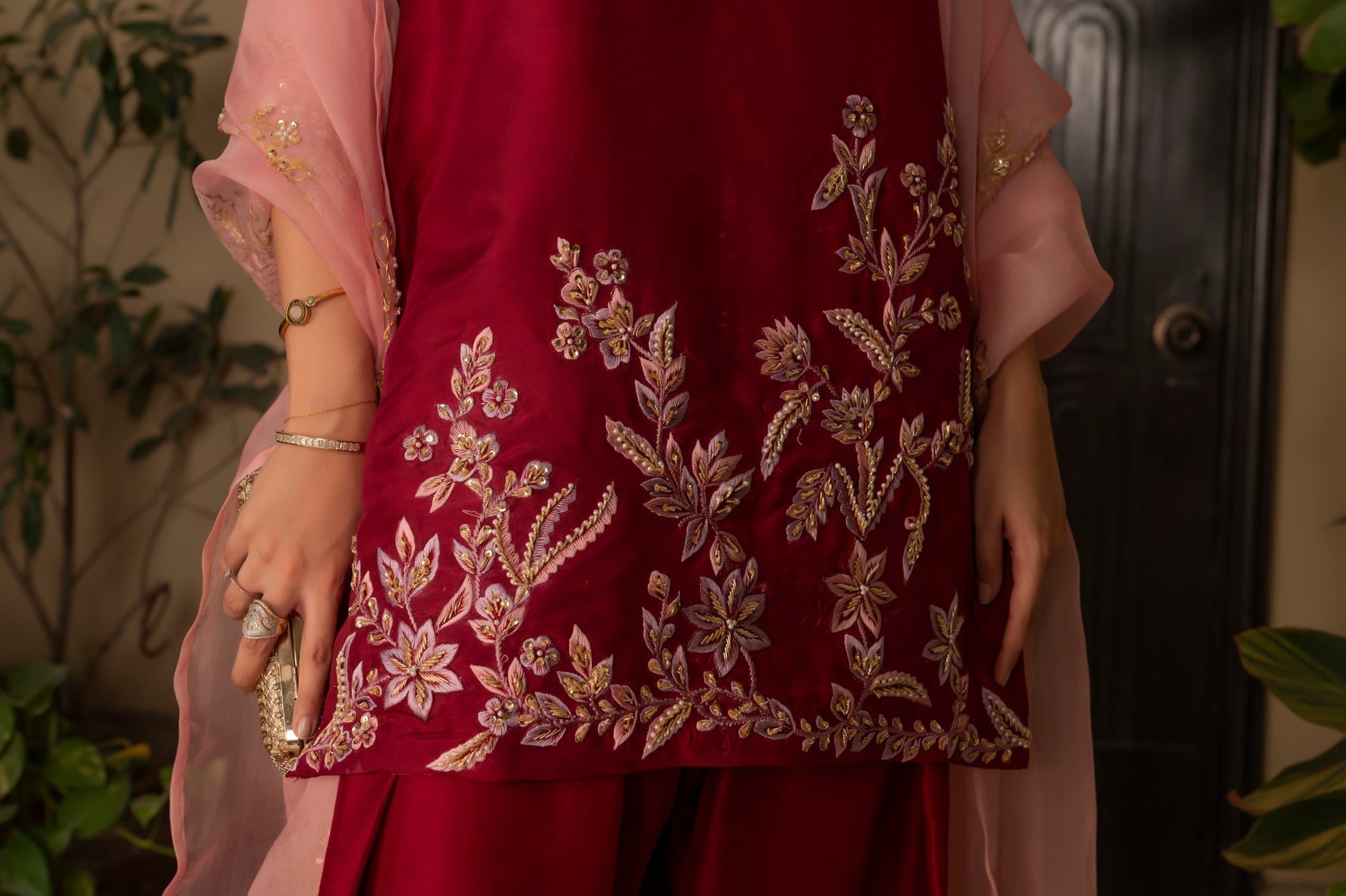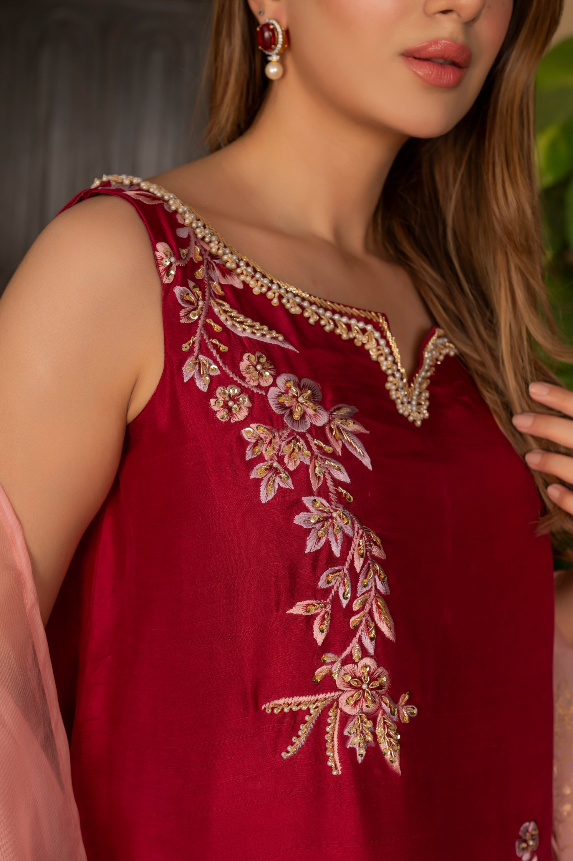 3piece formal with multi coloured resham embroidery, including shades of chai pink tones on a deep red canvas. Previously introduced as ‘Azure in blue’