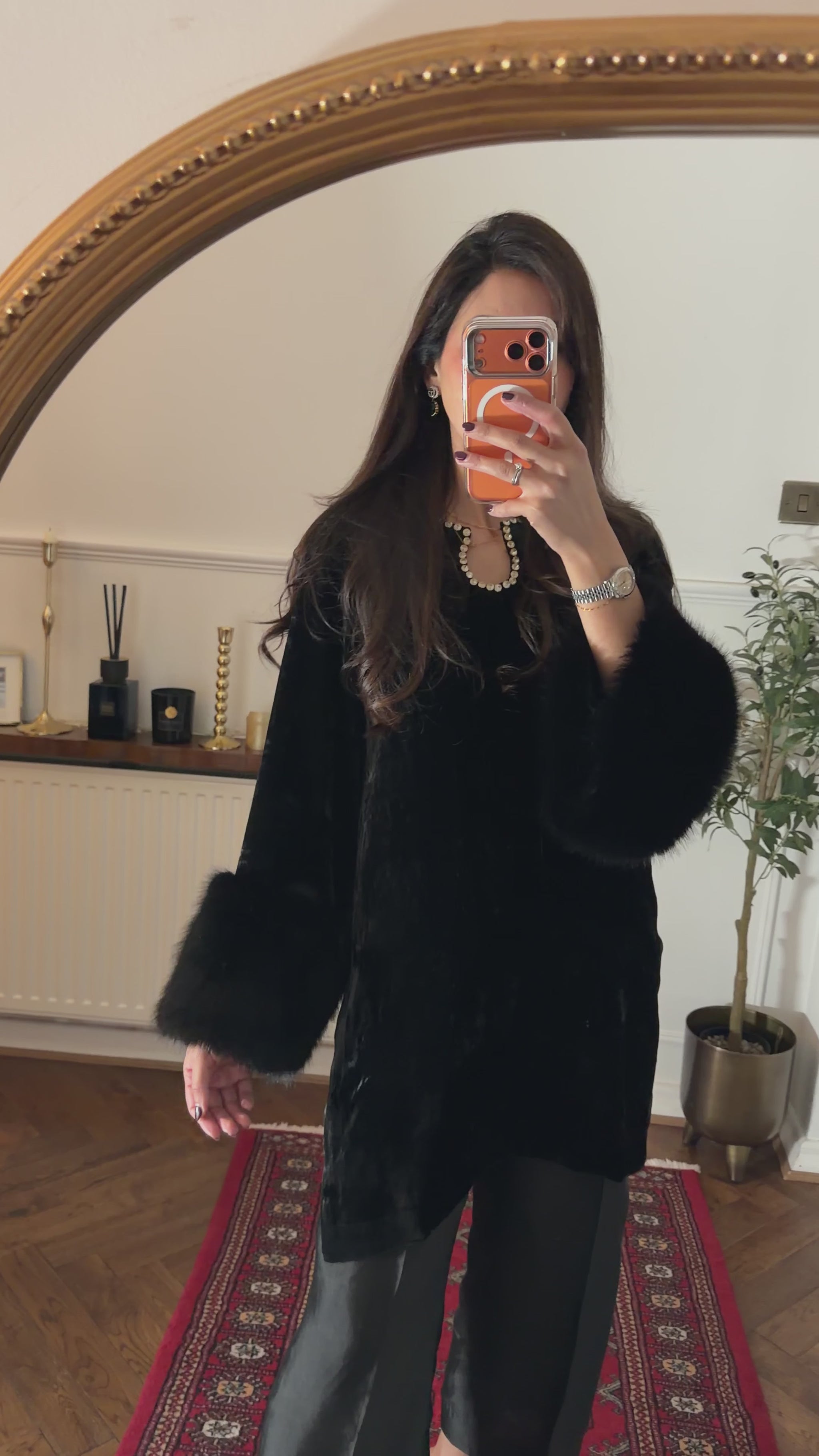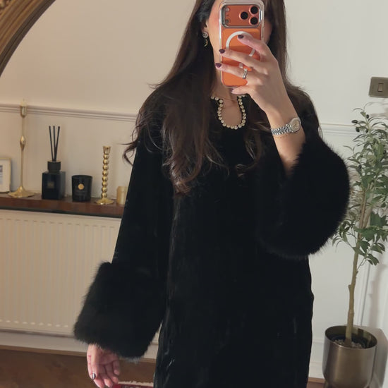 Pure French velvet shirt further enhanced with luxury faux fur sleeve details and rhinestones on the neckline.