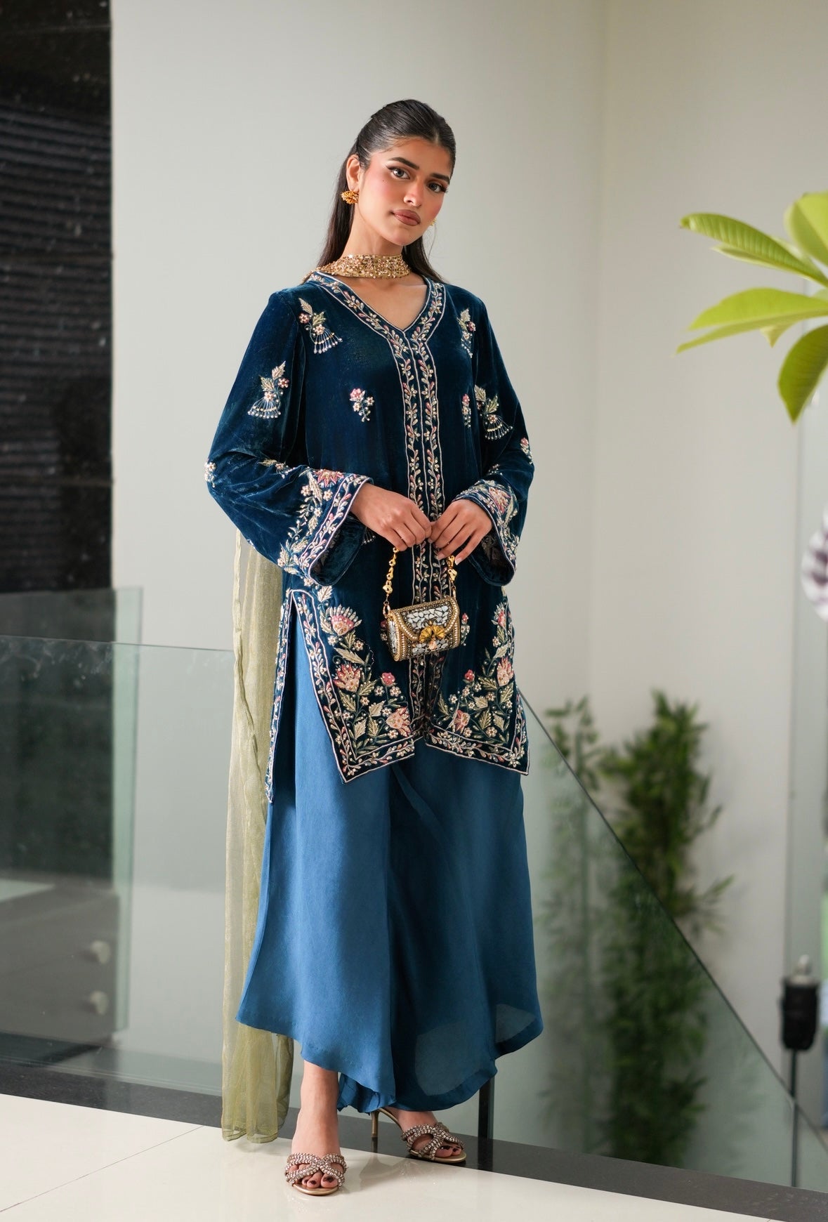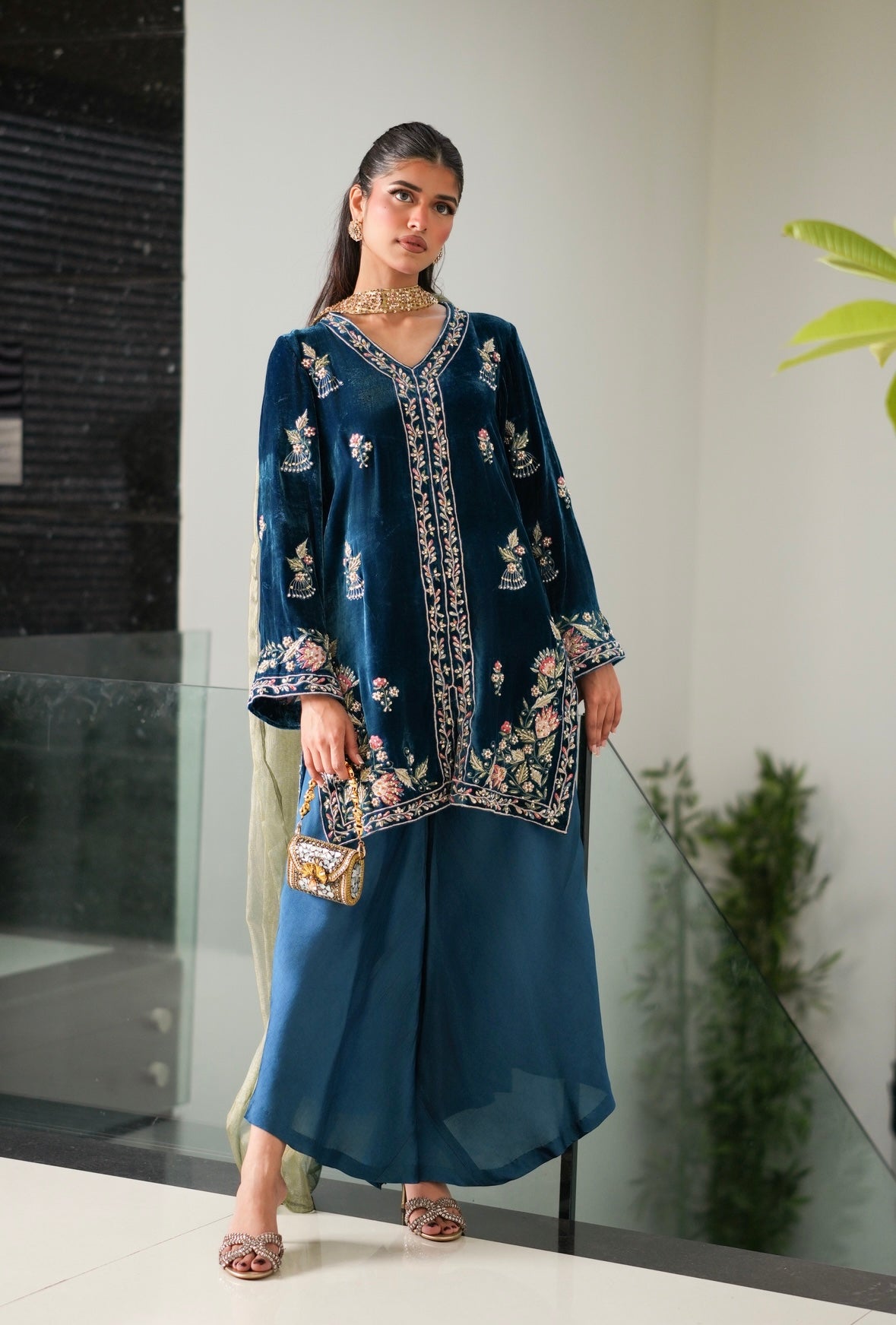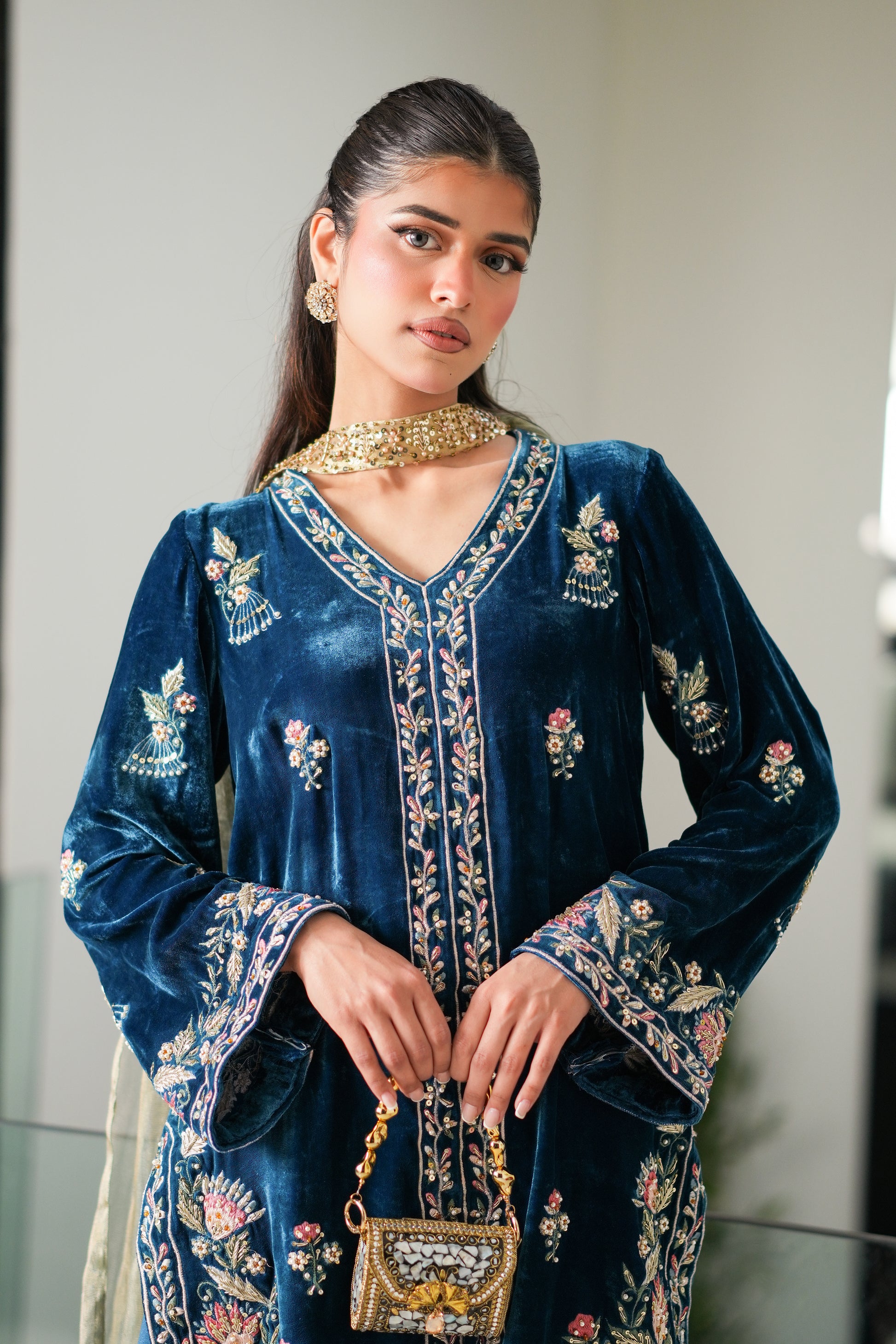 This 3piece formal consists of multi coloured resham embroidery including shades of pastel pink, blue and green on a Teal Blue canvas.