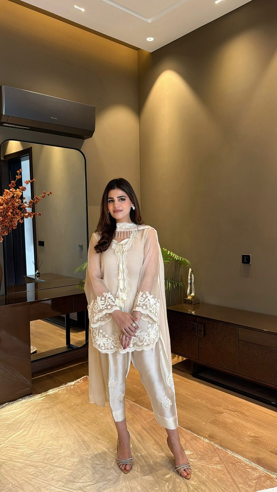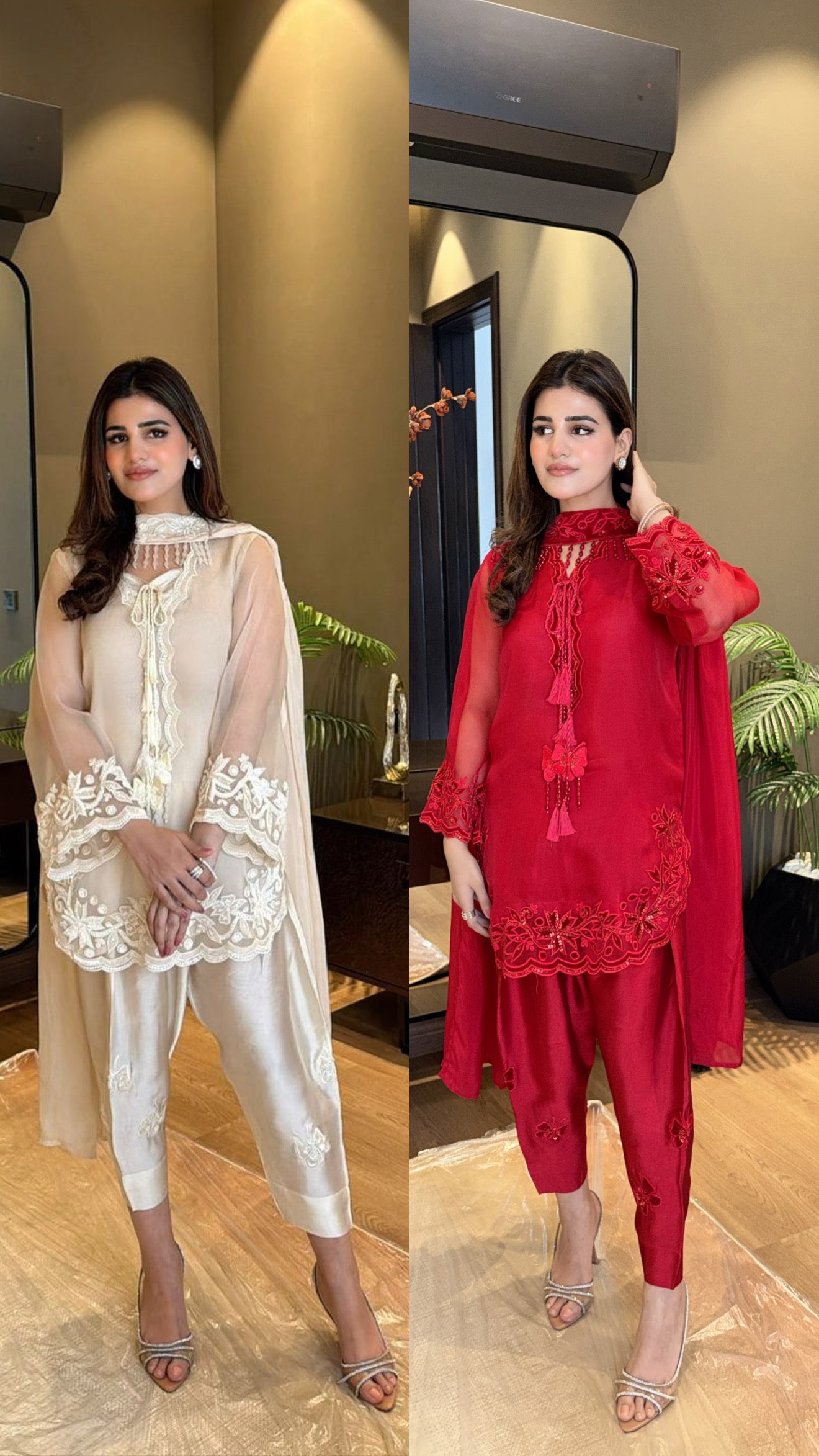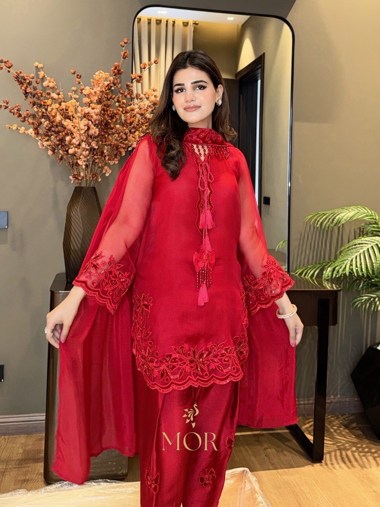 Velvet applique with hand work on a pure organza canvas. Inner lining and shalwar made up of Shesha silk with velvet applique butterfly details on the base.