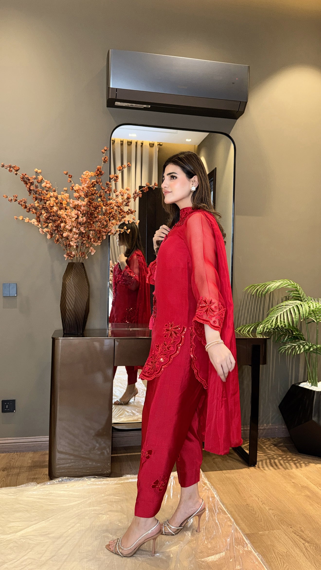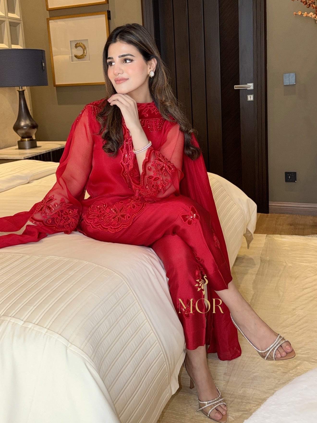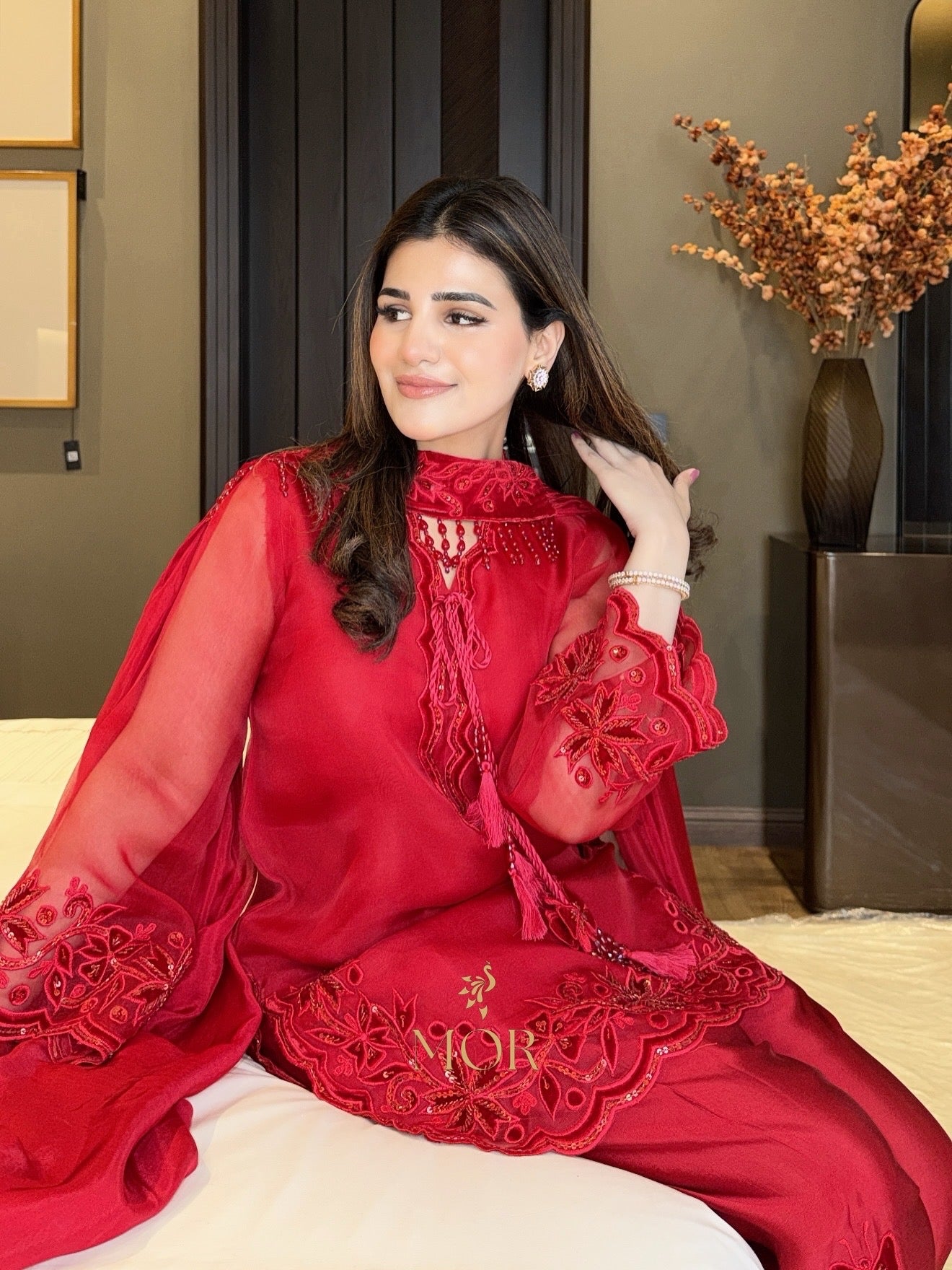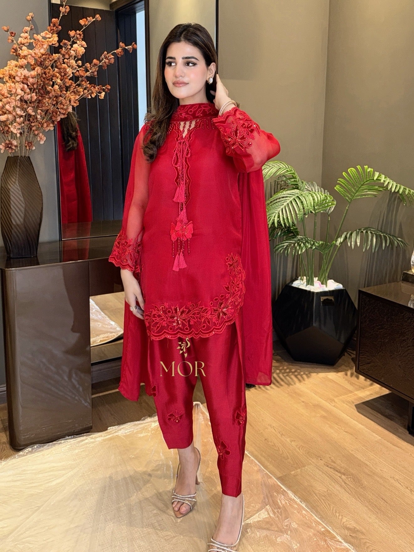 Velvet applique with hand work on a pure organza canvas. Inner lining and shalwar made up of Shesha silk with velvet applique butterfly details on the base.