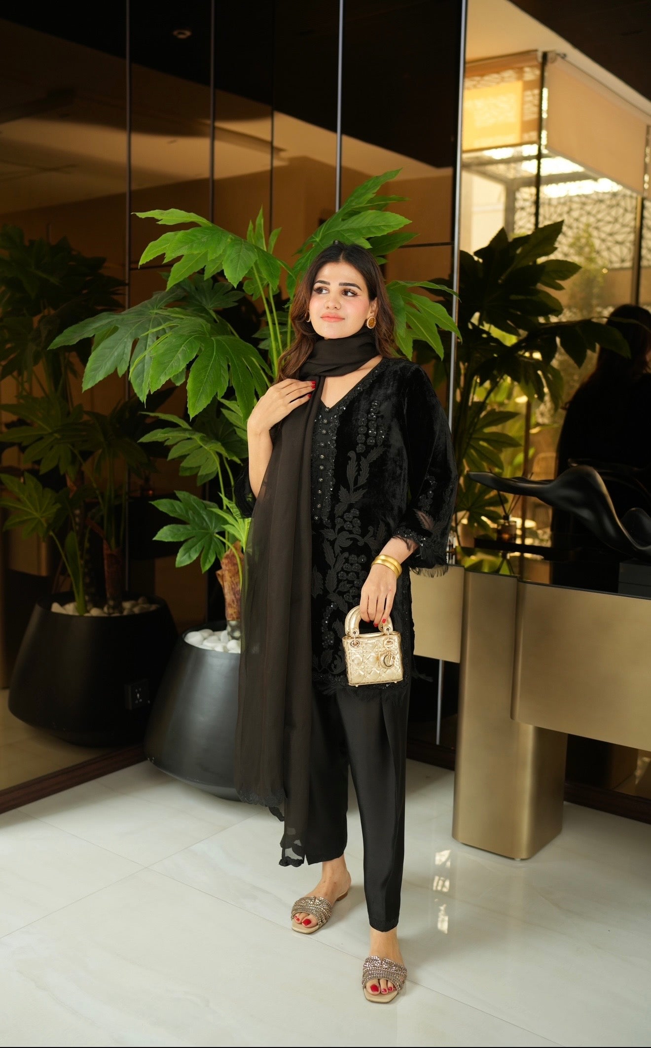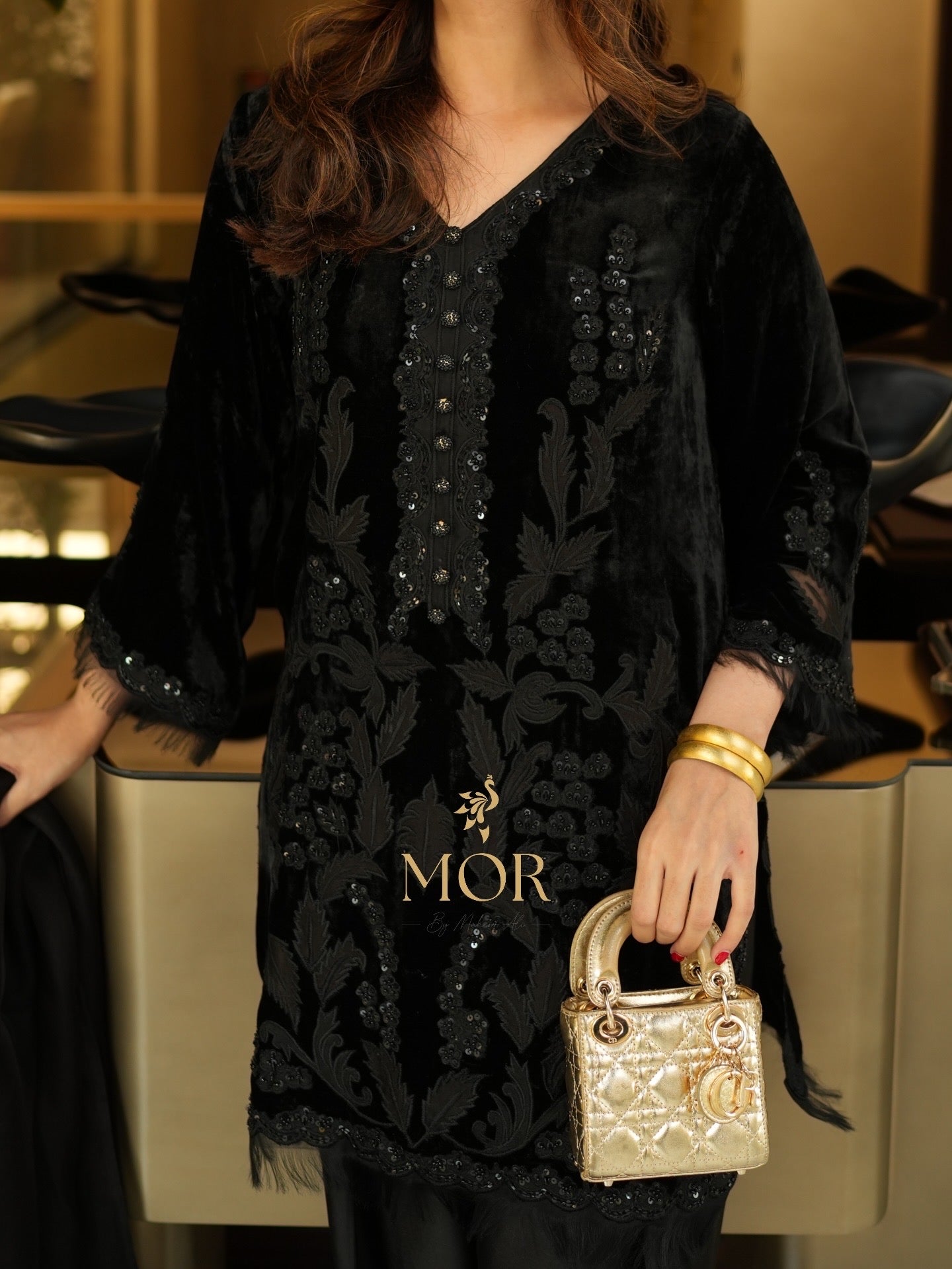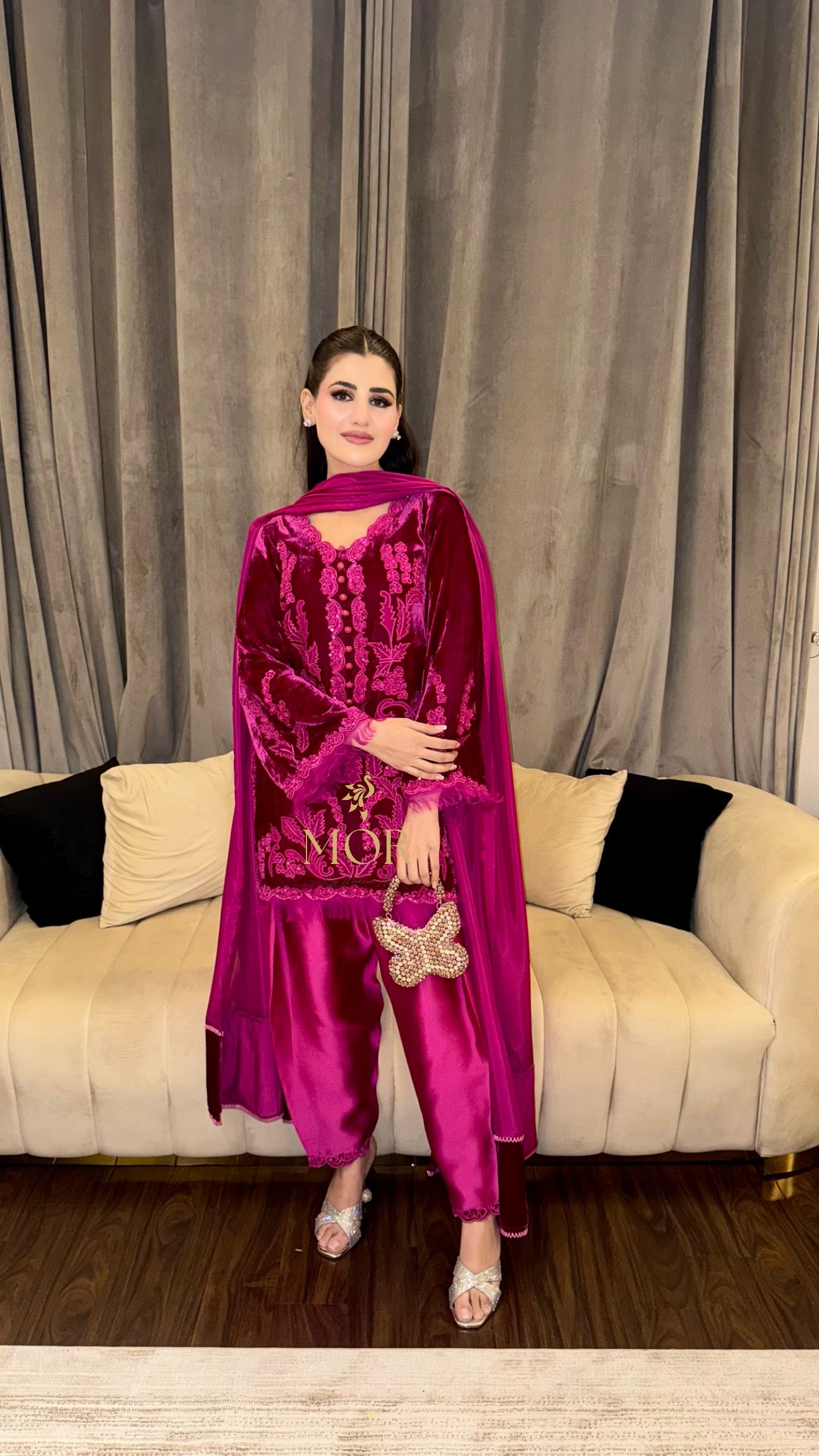 This short velvet shirt is rendered with detailed floral applique work throughout, further enhanced with hand worked sequence, including embellished buttons down the neckline. Paired with a tissue silk shalwar and pure organza dupatta.